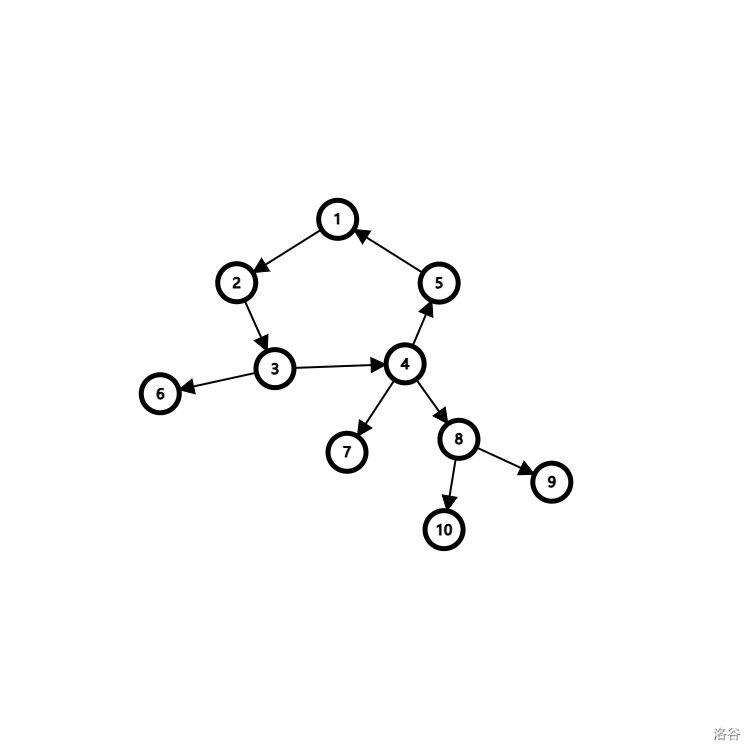 注意建边是反向建边,返祖就是逆流而上: 。我们在返祖的过程中用 数组标记走过的点,则遇到一个标记过的点就是环上的一端,而此时的位置就是另一端。还是很显然的,因为不会经过自己的儿子,所以这一定是一条逆向的返祖边。