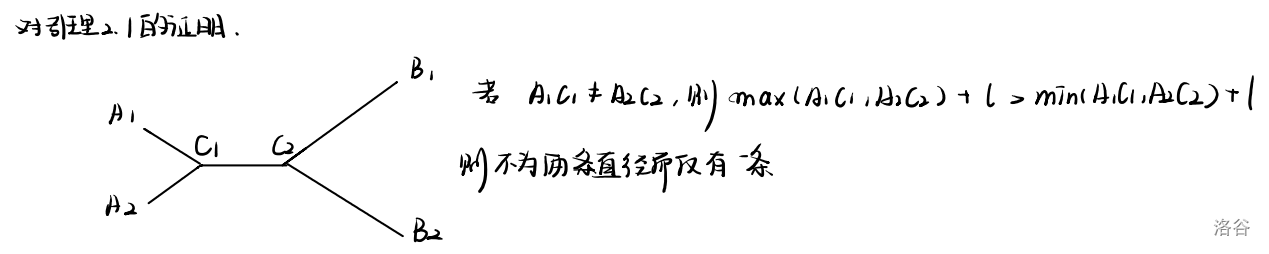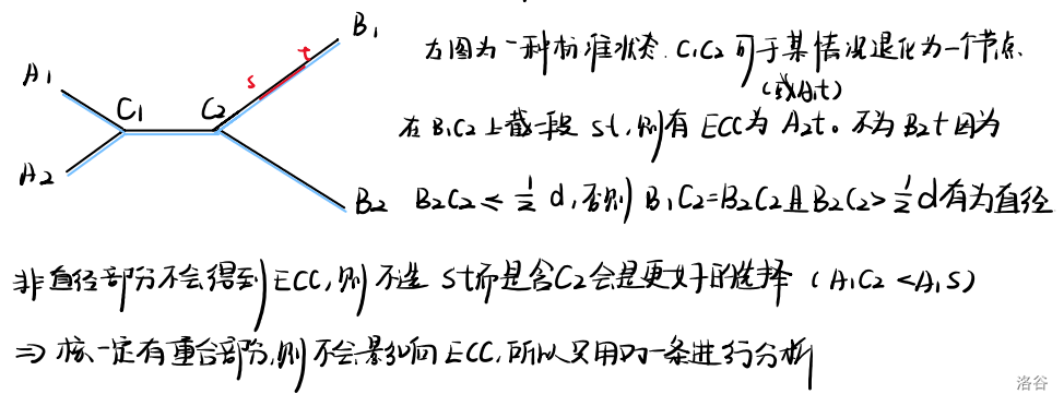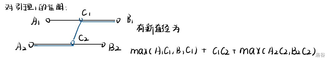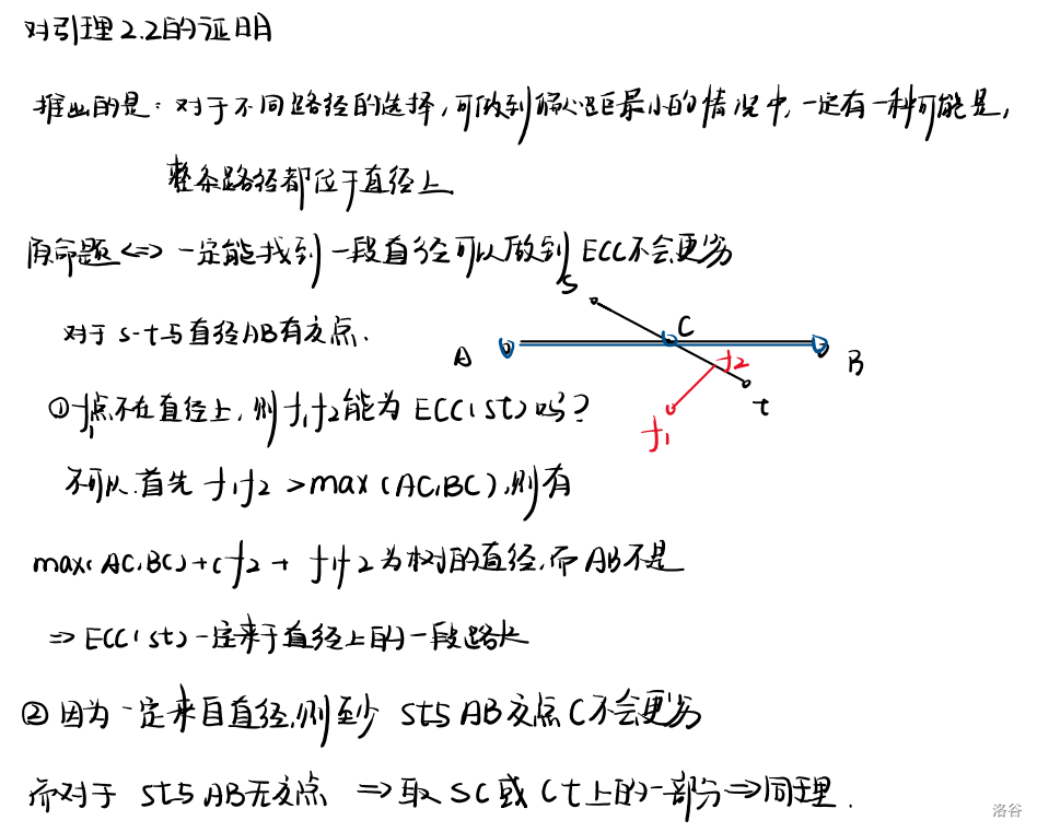 引理 2.2:若路径存在不位于直径上的部分,这条路径对应的偏心距一定不会比全部位于直径上的路径的偏心距的最小值更小。