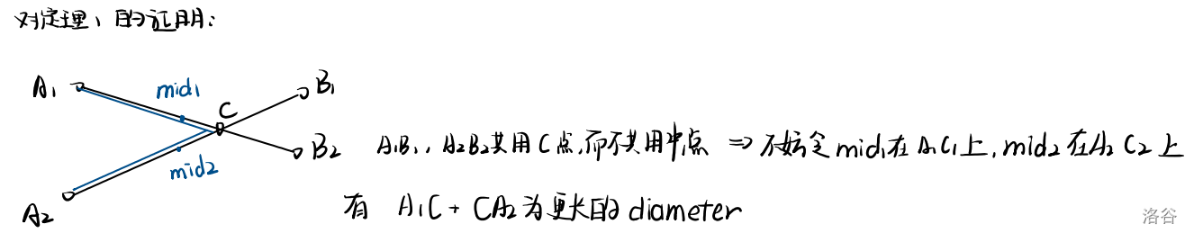 大部分的证明都是通过反证法,而反证的一个重点就是推出原本设定的直径在该情况下并不是真正的直径,从而推出矛盾。推荐同学们自己推一推。